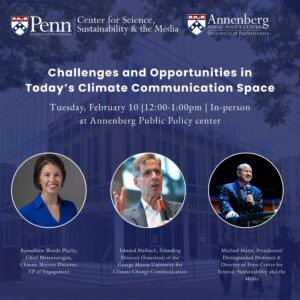 Join the Penn Center for Science, Sustainability and the Media (PCSSM) and the Annenberg Public Policy Center (APPC) for a moderated discussion on challenges and opportunities currently in climate change communication. This discussion will be framed with communication being a climate solution, laying a foundation from “knowing your audience”, discussing opportunities and challenges, and equipping attendees with effective and practical communication techniques and resources that they can start using right away. PCSSM Director Michael Mann will moderate the discussion with panelists Bernadette Woods Placky (Climate Central) and Edward Maibach (George Mason University).